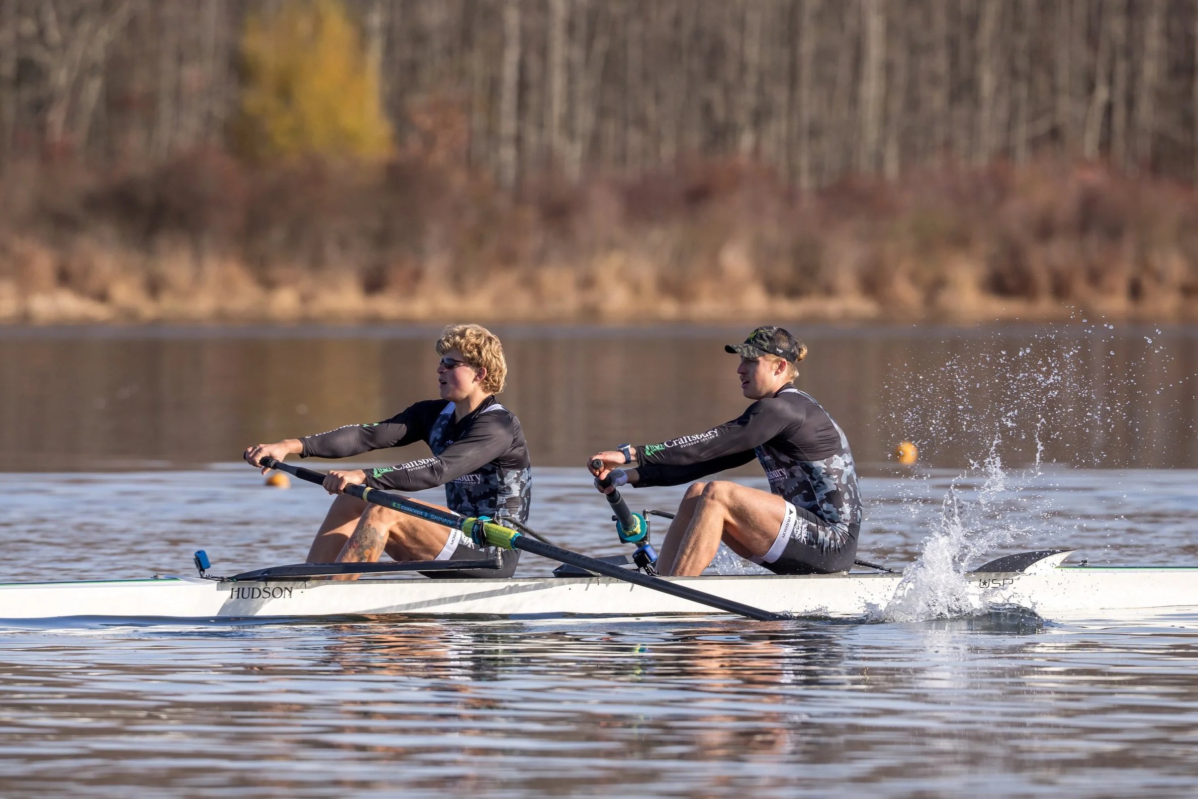 Jesse Ryno and Quin Woods racing the M2- time trial at Fall Speed Order. Photo by Row2k, 2025.