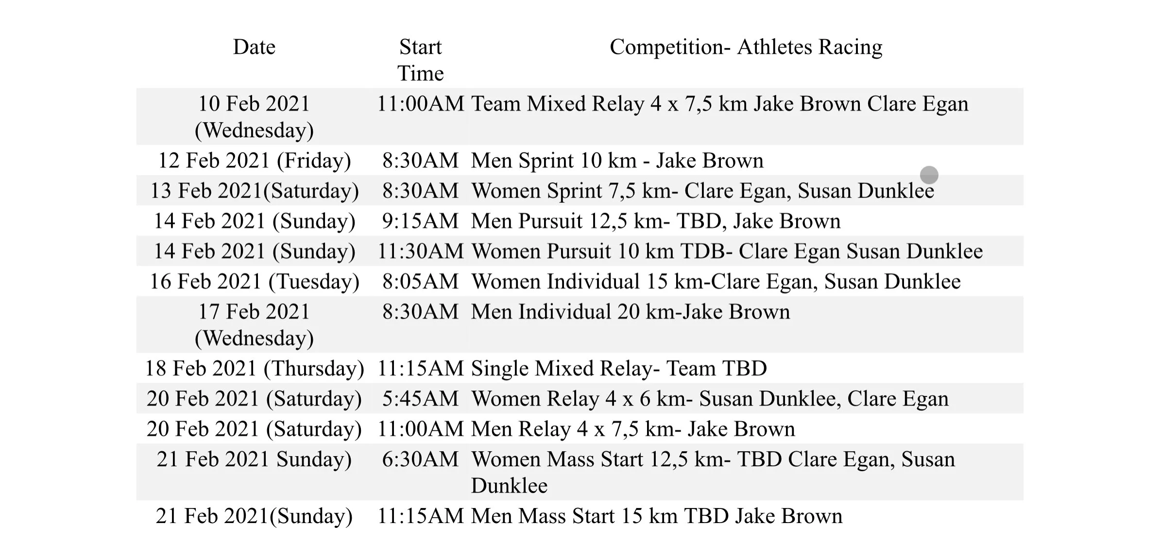 GRP Biathletes Susan Dunklee, Clare Egan and Jake Brown are set to begin competition at the 2021 IBU Biathlon World Championships in Pokljuka, Slovenia.