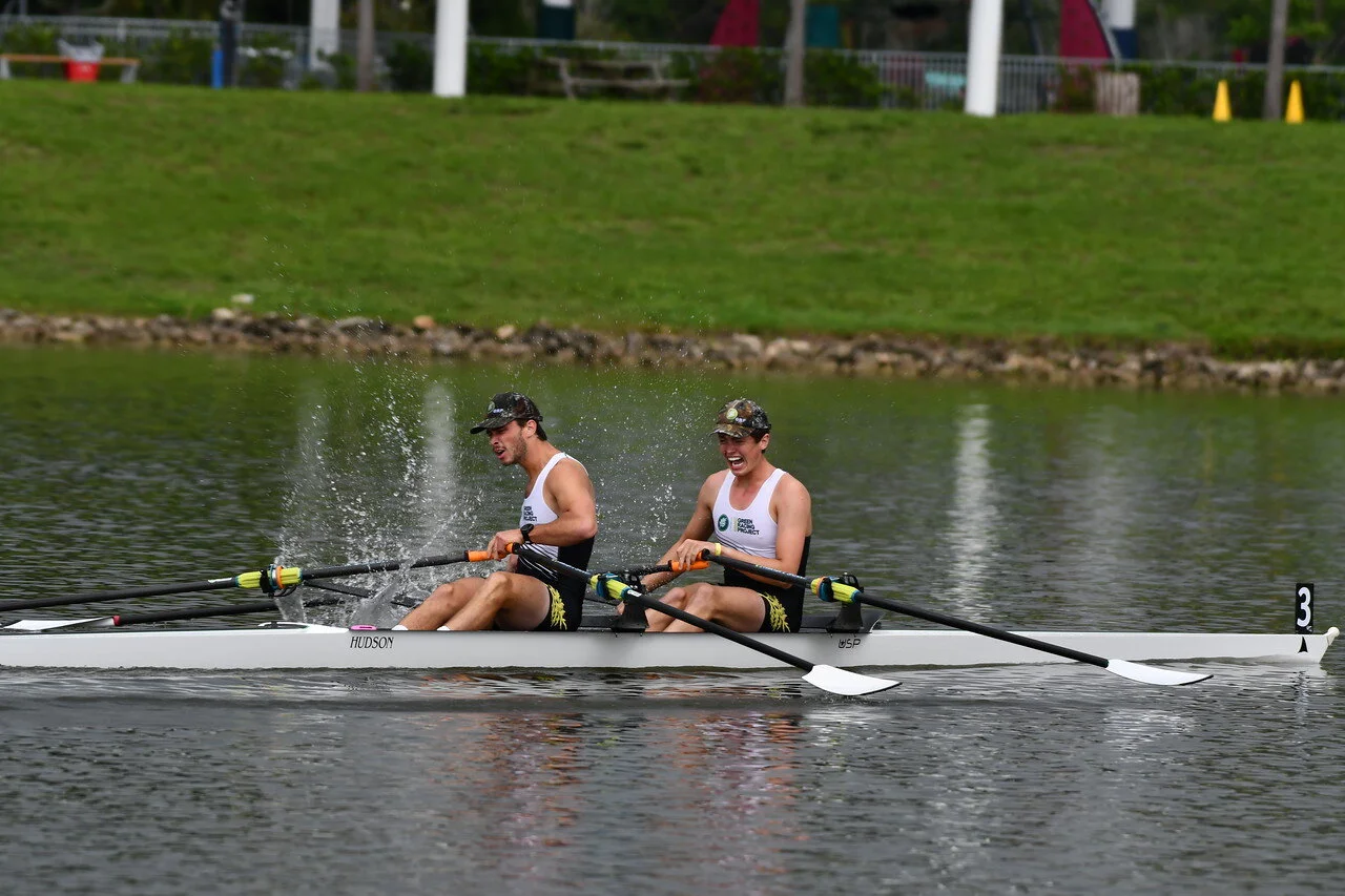 Tucker (stroke) and Simon (bow) after winning U23 Trials (photo by USRowing)